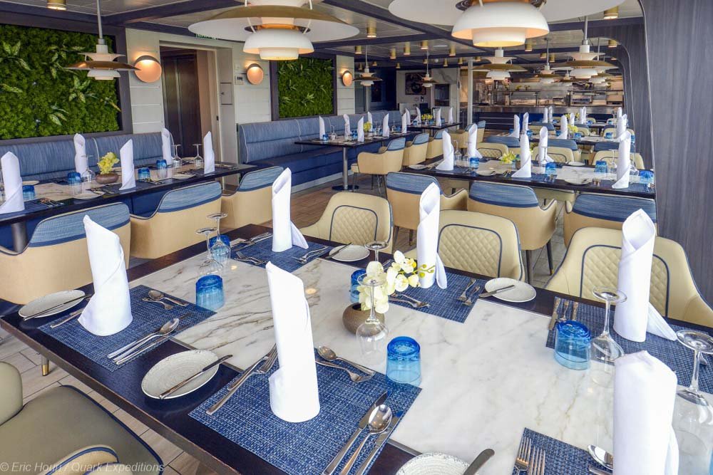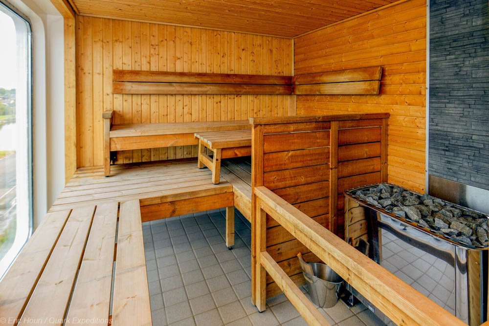 The interior is contemporary and thoughtfully designed. Ninety-five percent of cabins feature a private balcony. Two outdoor hot tubs and a sauna with ocean views provide the perfect place to warm up after time off the ship.