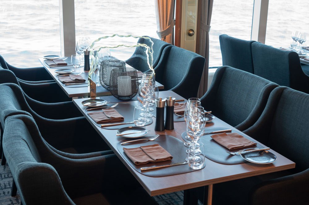 Lindstrøm: The specialty restaurant onboard MS Fram is complimentary for suite guests. Service is à la carte, with a six-course dinner menu. Dinner is also available for non-suite guests at an additional cost.