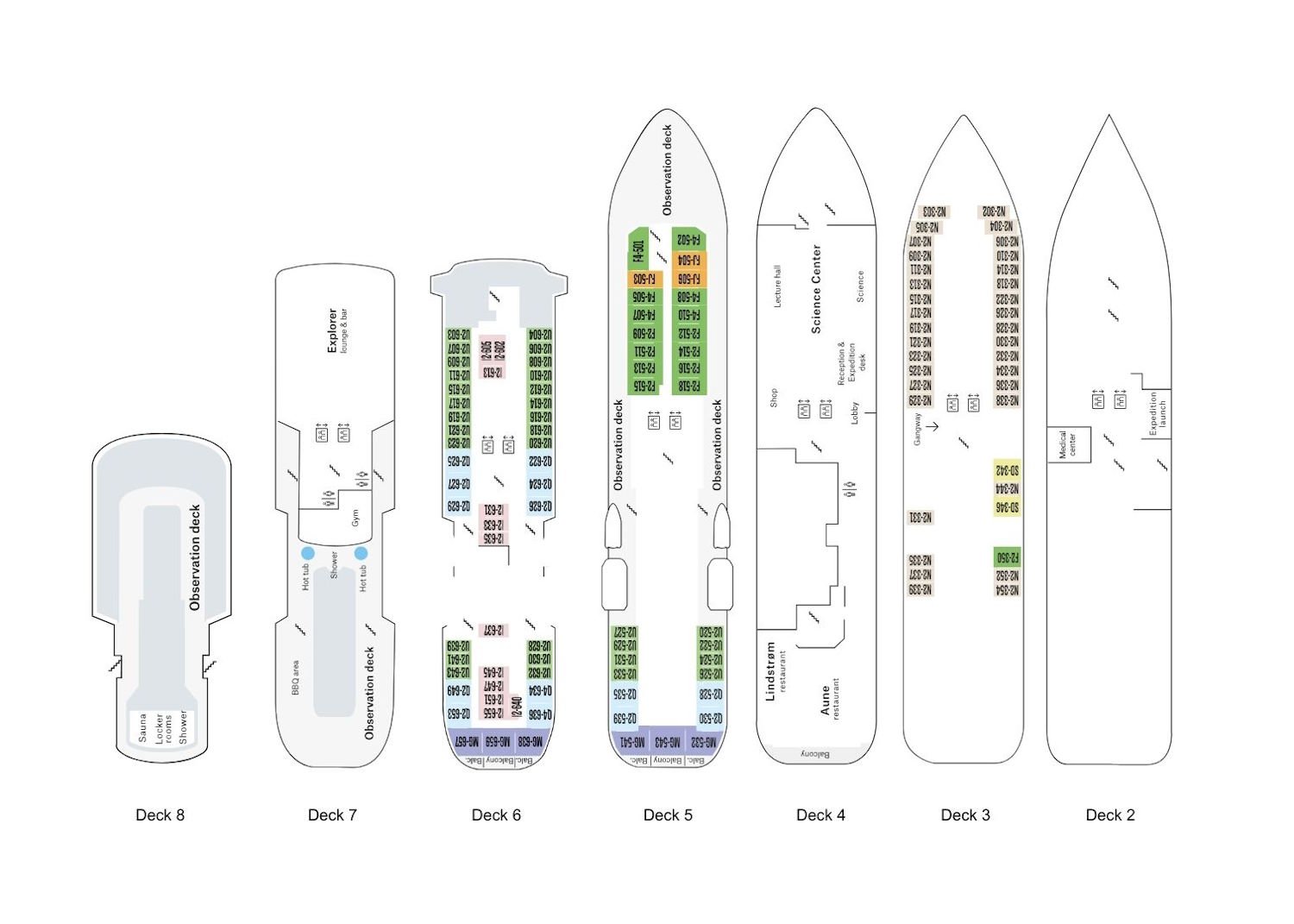 The premium restaurant Lindstrøm is also included for suite guests for breakfast, lunch, and dinner. Guests booked in cabins may dine there for dinner at an additional cost.