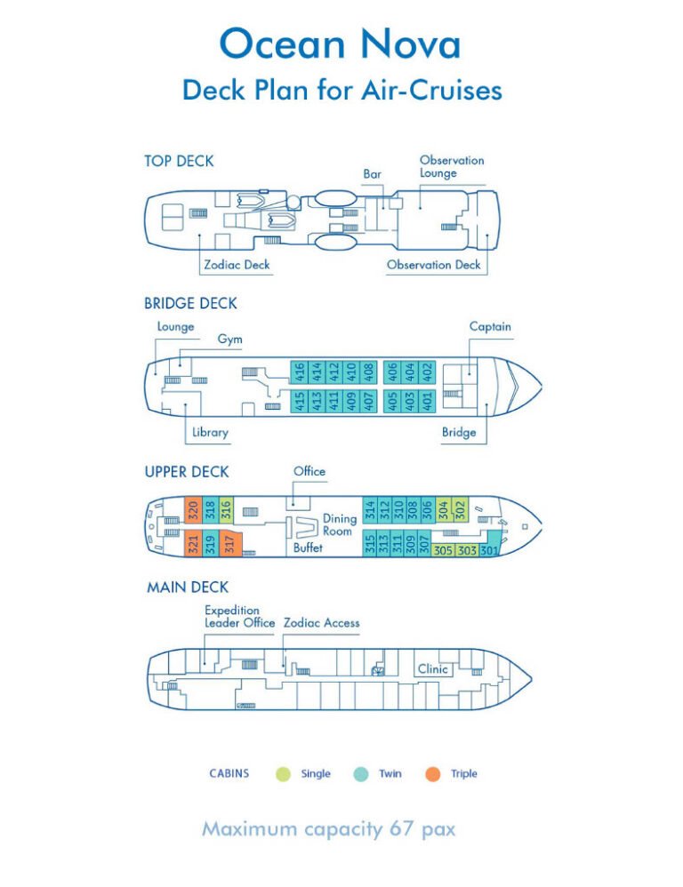 - The compact cabins all include private bathrooms, making Ocean Nova an affordable and comfortable choice for fly-cruise itineraries without sailing the Drake Passage.
